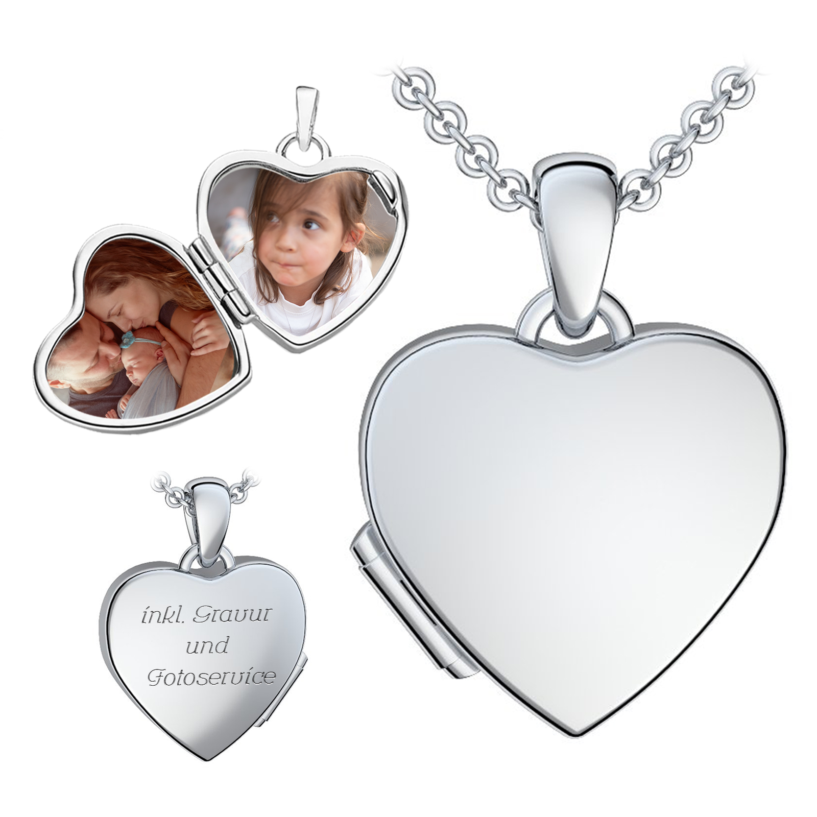 Das süße Kinder Herzmedaillon „Little Love“ von AMOONIC besteht aus hochwertigem Sterling Silber 925 (rhodiniert mit Anlaufschutz). Die Kette ist 38cm lang und schließt mit einem stabilen Federringverschluß. Der aufklappbare Herz Anhänger ist mit 2 Fotos bestückbar und kann mit Ihrer Wunsch-Gravur auf der Rückseite personalisiert werden. Mit dem Foto-Service laden Sie die Bilder direkt auf unserer Webseite hoch und erhalten das Medaillon fertig inkl. der Bilder. Fertig zum Verschenken befindet sich das Medallion in einem kleinem Schmuck-Täschchen mit Zertifikat. Das Amulett macht den besonderen Tag Ihres Kindes zu einer unvergesslichen Erinnerung und wird Ihr Kind täglich begleiten. Es ist das ideale Schmuck Geschenk für besondere Anlässe, wie z.B. die Geburt, Taufe, Kommunion, Einschulung, Weihnachten, Geburtstag oder auch als Andenken z.B. an ein verstorbenes Haustier.