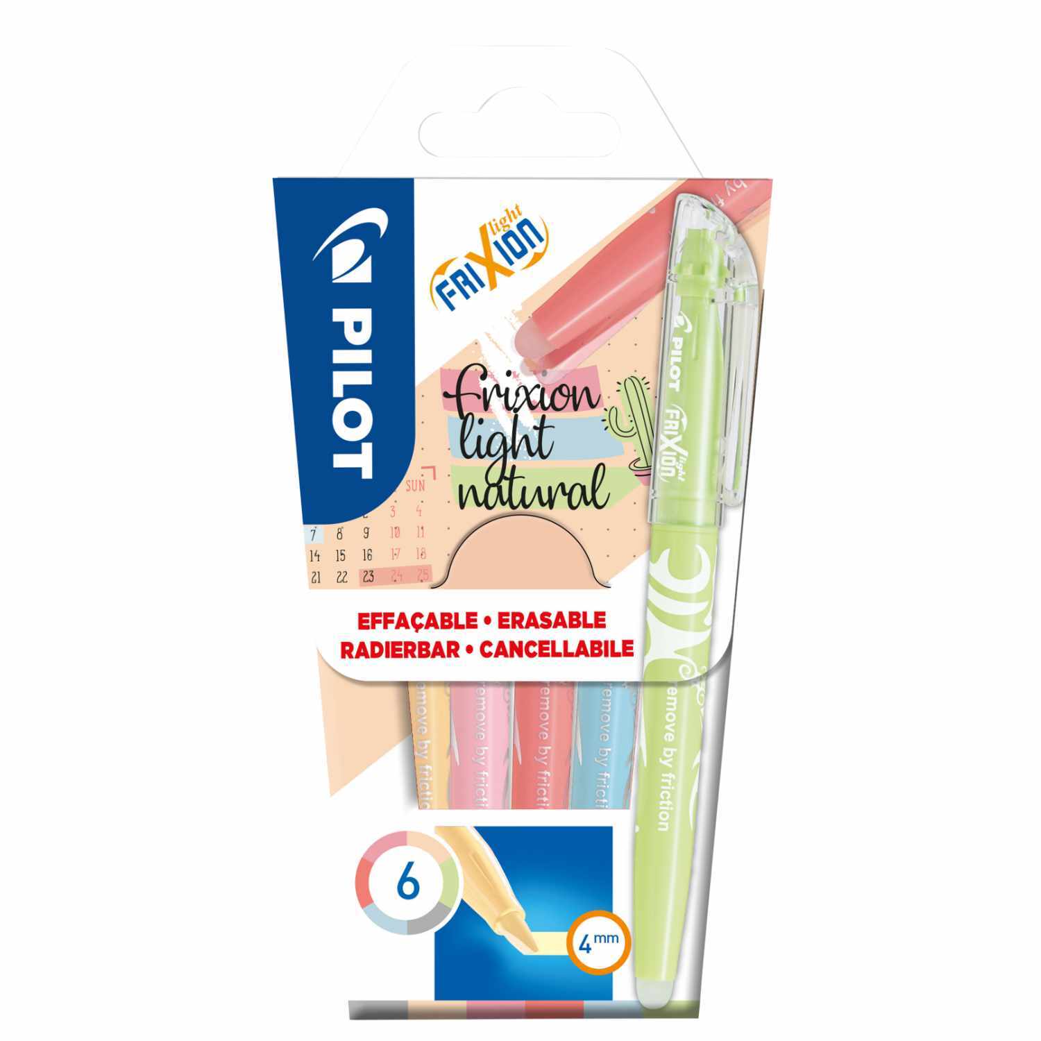 Die Frixion Light Natural Textmarker eignen sich natürlich bestens zum Unterschreichen und Markieren von Textpassagen, aber auch fürs Handlettering oder zum Akzentuieren im Bullet Diary. Der Marker ist mit einer Keilspitze ausgestatte. Dadurch sind sowohl feine, als auch breite Linien von bis zu 3,3 mm möglich. Der Textmarker muss weder geschüttelt noch angepumpt werden. Der Frixion Light Natural ist radierbar, da er die patentierte, thermointensive Frixion-Tinte enthält. Dank dieser speziellen Tinte können kleine Makel im Handumdrehen weggerieben werden. Dazu einfach die Kunststoffkugel am Gehäuseende über das Papier reiben. Durch die Reibungswärme wird die Tinte unsichtbar. Der Frixion Light Natural hat seinen Namen absolut verdient. Er besteht zu mindestens 50% aus recyceltem Material und verbessert die CO2-Bilanz im Vergleich zu einem Textmarker ohne Recyclinganteil um 33%. radierbare Textmarker in den Farben Skyblue, Hellgrün, Grau, Rot, Koralle und Apricot mit Keilspitze Strichbreite: bis zu 3,3 mm